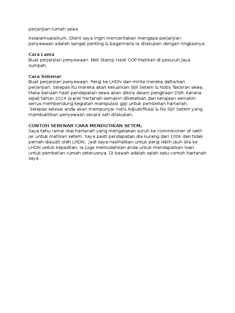 Perjanjian sewa perlu dibuat selepas semua dokumen ditandatangani serta bayaran deposit dibuat iaitu sebelum penyewa masuk ke rumah. Mati setem perjanjian sewa rumah di lhdn dan dikuatkuasakan sejak 1 januari 2018. Walaubagaimanapun, sebarang perbelanjaan awal seperti kos pengiklanan, yuran guaman, duti setem sewa rumah serta. Contoh perjanjian sewa rumah dapat memudahkan urusan pemilik rumah dan penyewa dalam memastikan tidak berlaku salah faham di kemudian hari. Duti setem memastikan bahawa jika terdapat pertelingkahan dan keingkaran salah satu pihak dalam perjanjian sewa rumah nanti, maka dokumen perjanjian sewa rumah tersebut.