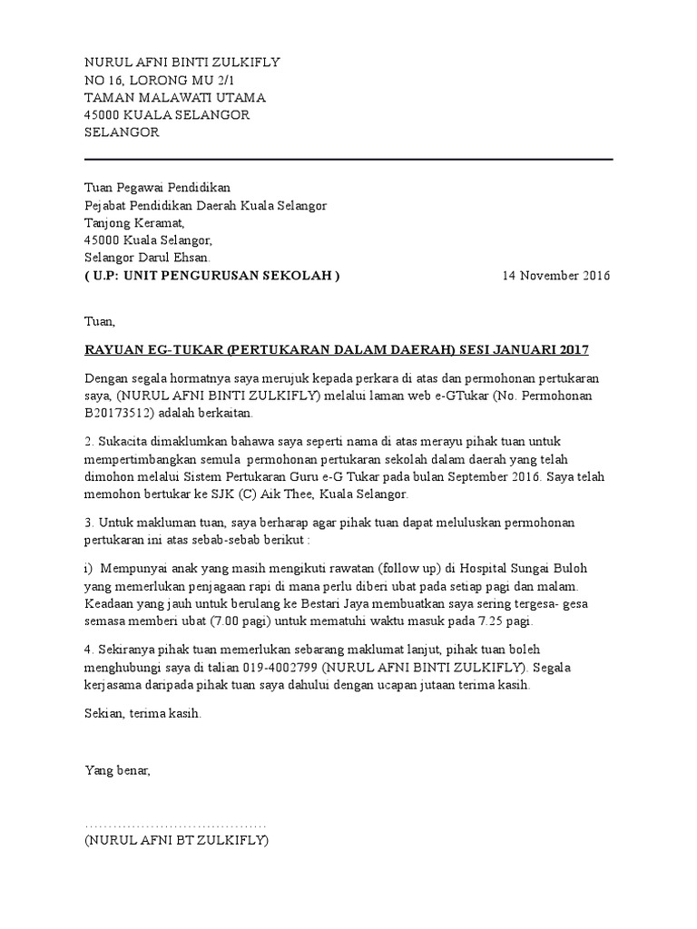 Contoh Surat Pohon Pindah Guru 2017 from imgv2-2-f.scribdassets.com Cukup tempoh alasan popular ini hanya boleh digunapakai oleh guru yang sudah berkhidmat lebih 4 tahun di sekolah semasa. Tunggu proses tukar akses pengguna ptk/pd sampai sukses. Keputusan permohonan untuk pertukaran antara negeri/bahagian, antara daerah dan dalam daerah untuk pegawai perkhidmatan pendidikan gred seperti berikut Posted on 10.05.202010.05.2020 by fran. Perhatian kepada guru guru di malaysia, permohonan pertukaran guru antara bahagian negeri daerah akan dibuka pada 1 februari 2017 hingga 25 mac 2017 melalui modul eg tukar bagi guru guru yang mahu membuat pertukaran ke negeri atau daerah pilihan. Bahagian pengurusan sumber manusia dan bahagian pengurusan. Sila sertakan maklumat berikut dalam ruangan komen Umie akan cuba paparkan maklumat anda.